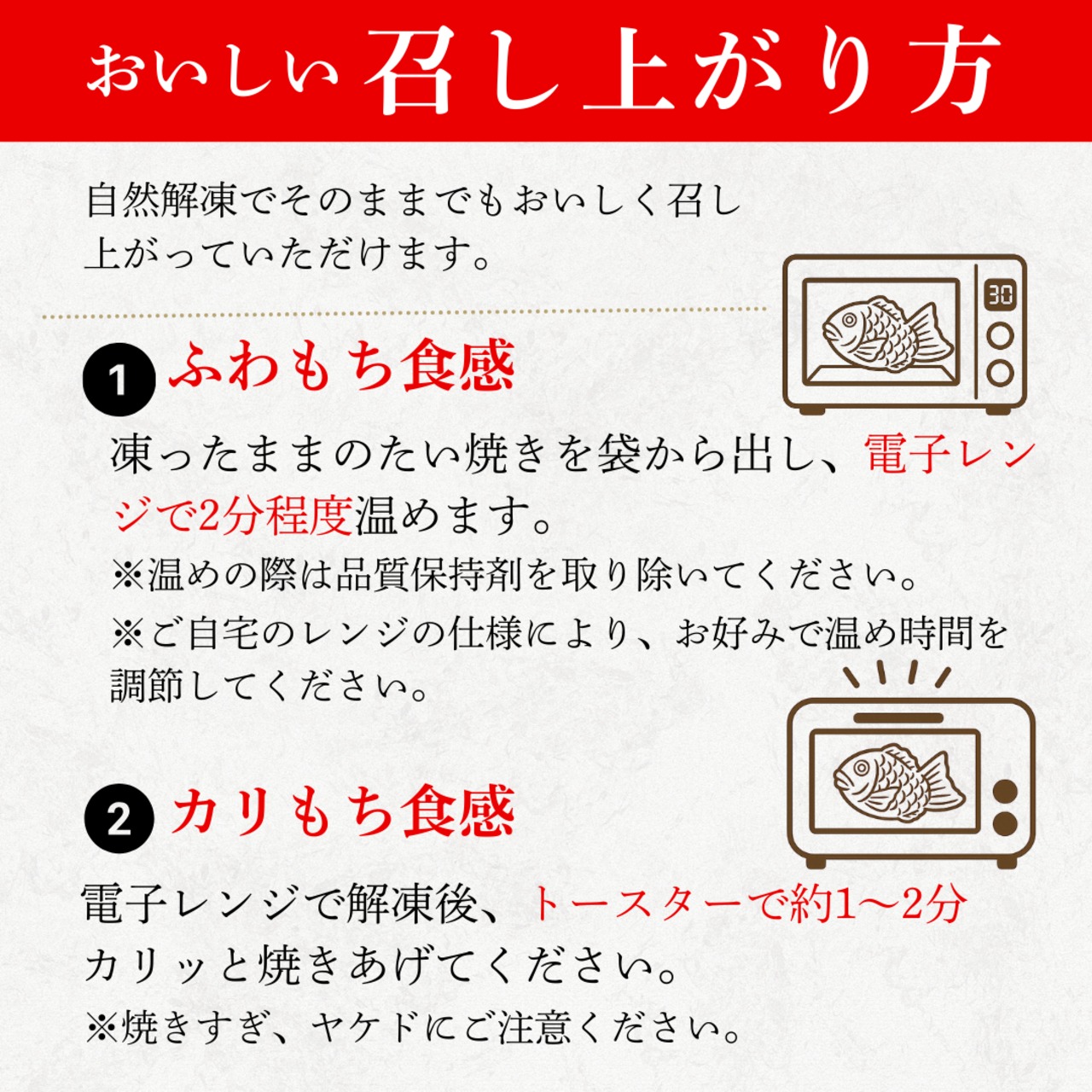 そのままでもおいしく召し上がっていただけますが、電子レンジやトースターを使用すると、できたての美味しさを楽しんでいただけます。
