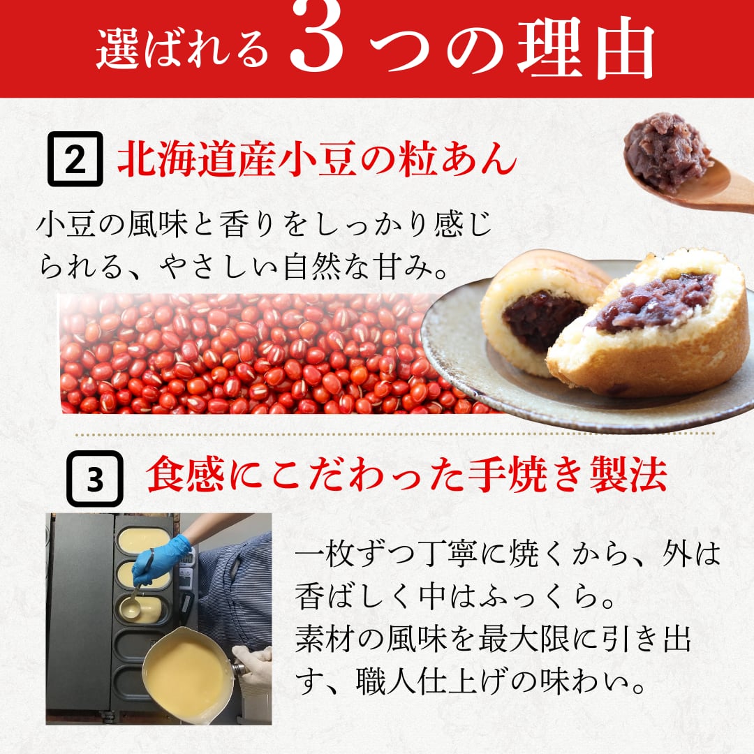 ■原材料:小豆、砂糖、小麦粉、米粉、卵、蜂蜜、食物油脂(乳・大豆を含む)、餅粉、還元水飴、食塩、寒天/トレハロース、膨張剤