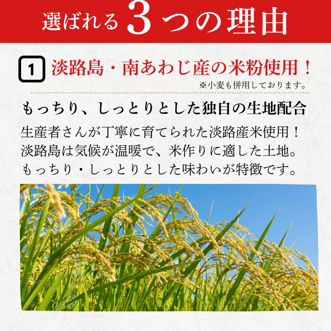 ・使用する米粉は淡路島産で、厳選された素材にこだわっています。淡路島の自社工場で安心・安全に手作りされているため、心ゆくまでお召し上がりいただけます。